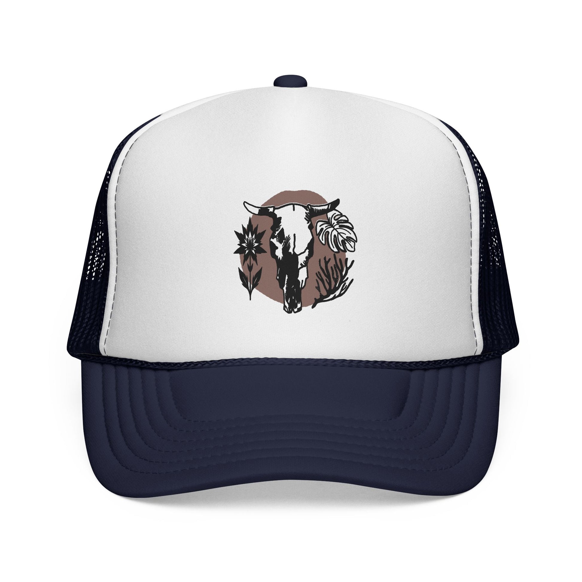 A laid-back trucker cap that brings subtle western charm to everyday wear. The structured foam front showcases a hand-drawn skull and floral emblem in warm earth tones, while the breathable mesh back keeps you cool.