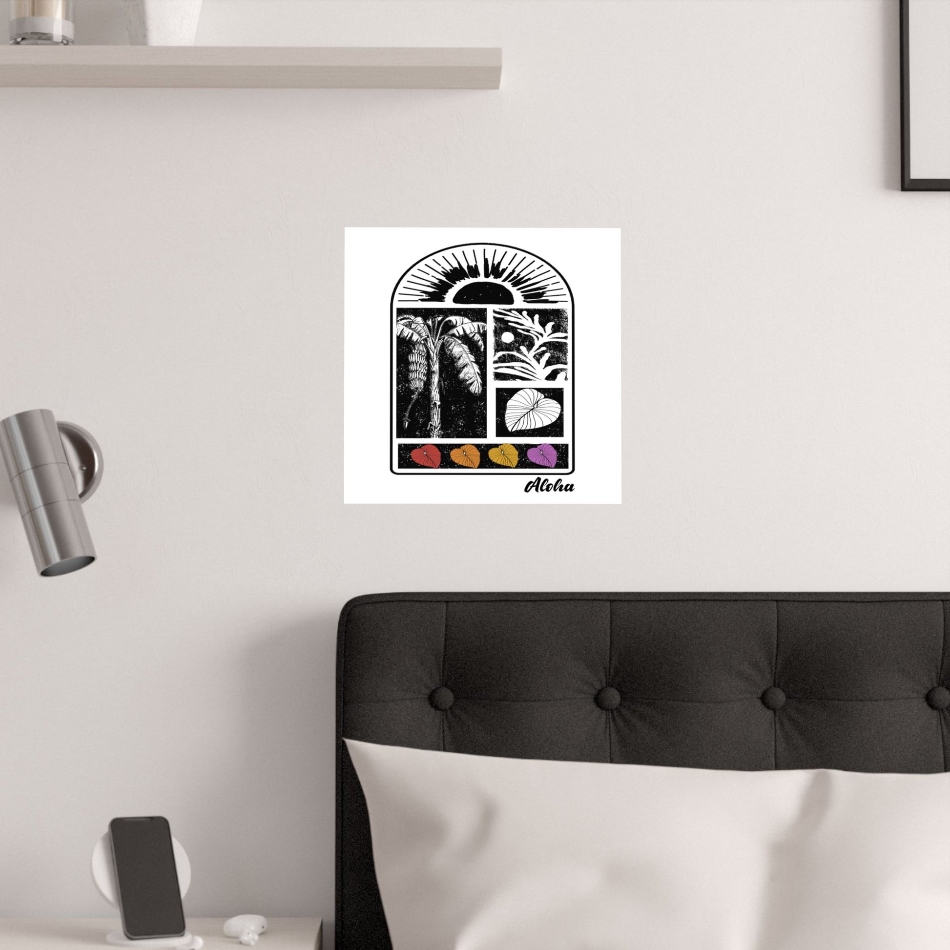 This satin poster captures a quiet Hawaiian moment, sunrise light spilling over palm fronds, textured tropical leaves, and a row of warm, sunset-hued hearts beneath a distressed black-and-white collage. The low-glare, museum-grade paper keeps it vivid and archival so the sun-drenched palette and crisp details hold up on your wall. Hang it in a reading nook, entryway, or above a low shelf to bring a calm, island-breezy energy to indoor spaces. The layout reads like a small window to the shore: tactile, slightly vintage, and quietly optimistic.