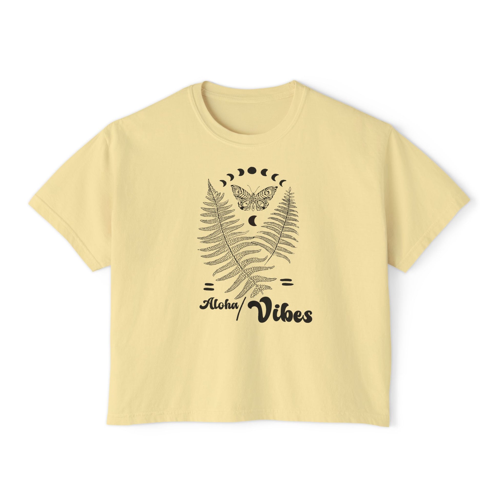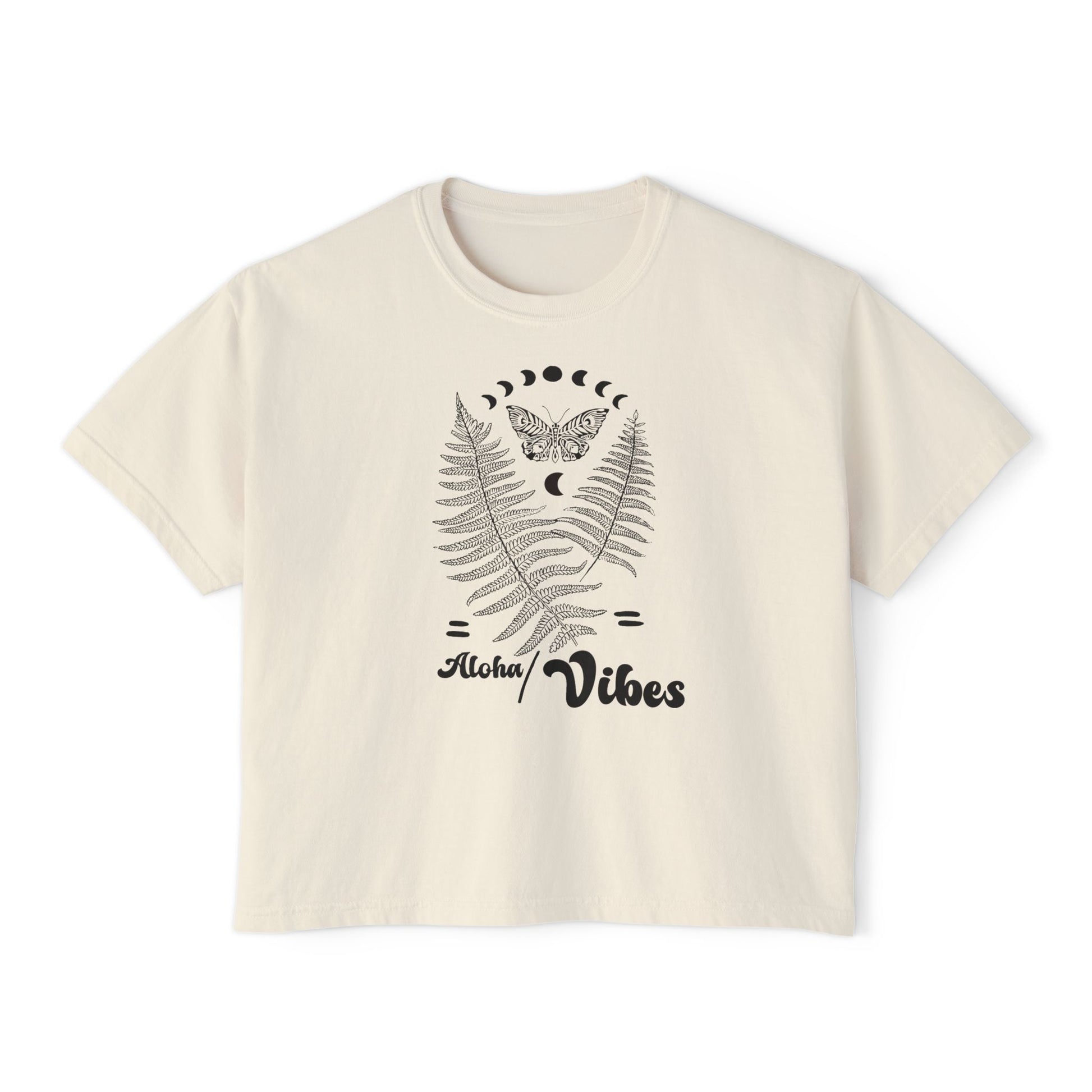 Light and airy with a touch of island daydreams, this boxy tee drifts between vintage comfort and modern ease. Soft, heavy-weight ring-spun cotton and pigment-dyed tones give the shirt a lived-in, sun-faded look that keeps getting better. A centered nature-inspired graphic, ferns cradling a moth beneath a lunar arc — reads like a quiet invitation to slow down. The cropped, boxy silhouette layers effortlessly over high-waist jeans or linen shorts. Wear it to beach bonfires, sunset walks, or lazy coffee mornings when you want something relaxed that still feels thoughtfully styled.