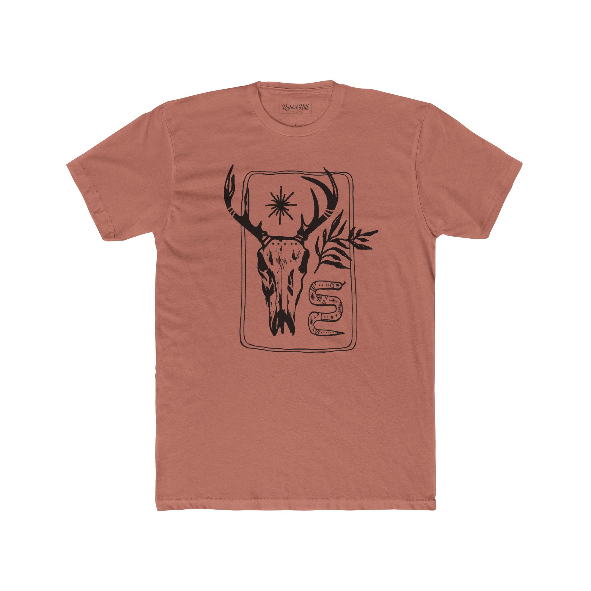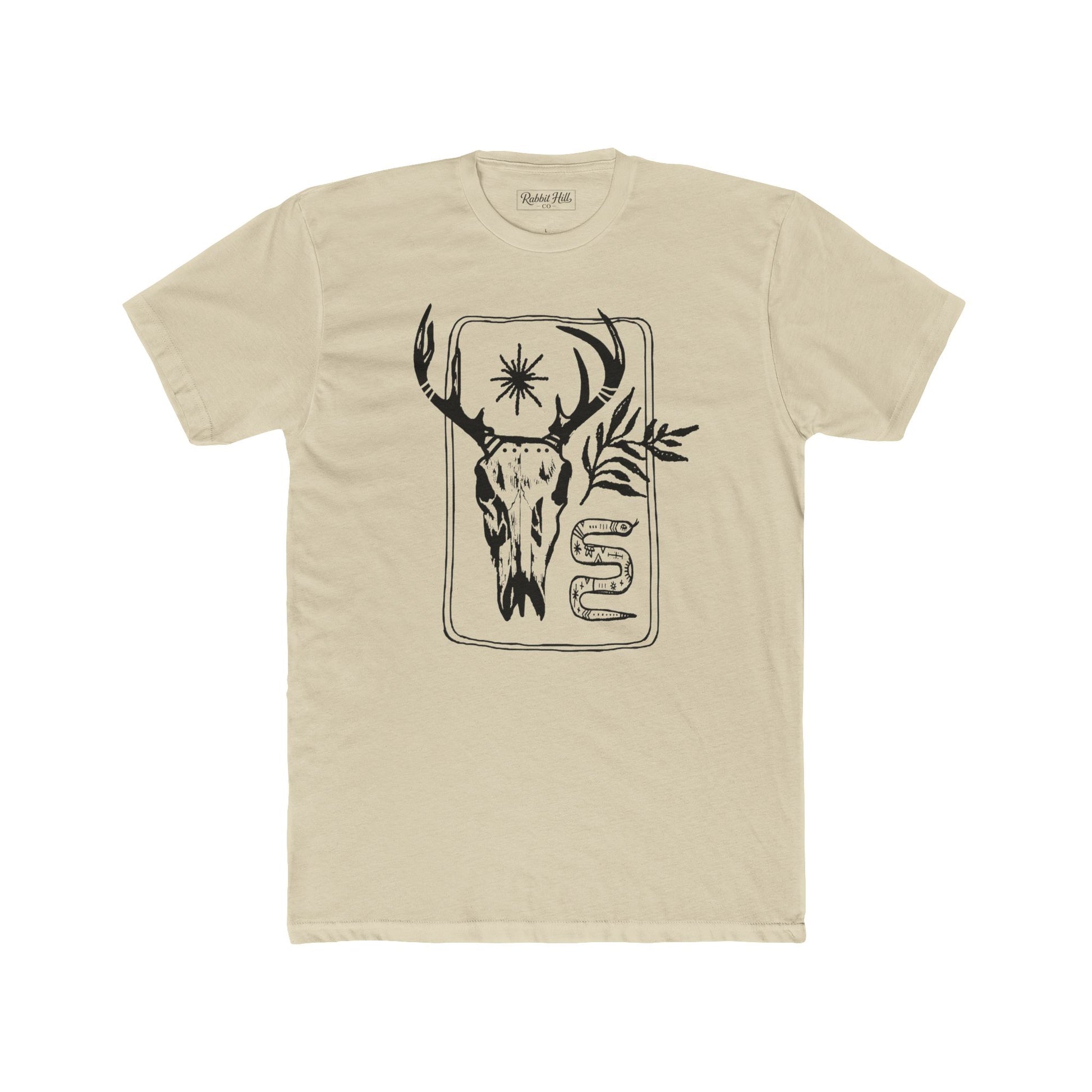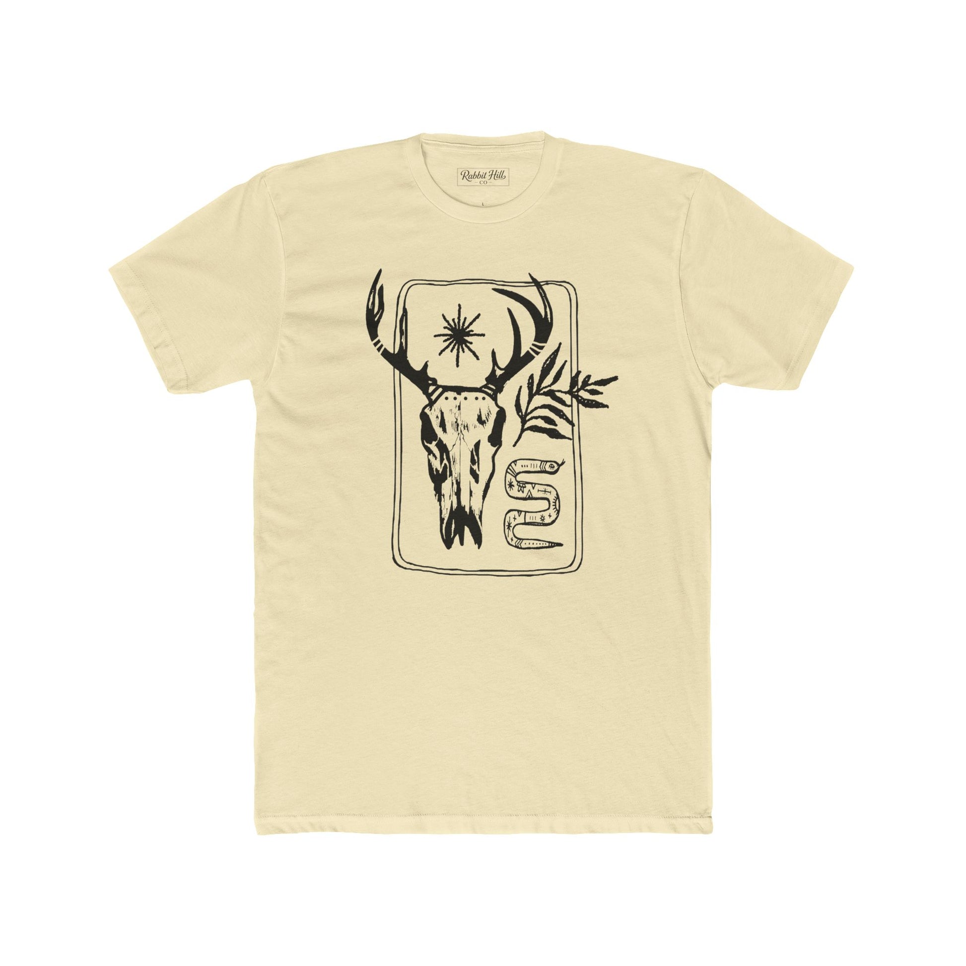 A lightweight cotton crew tee that brings quiet, woodsy energy to everyday wear. The front features a hand-drawn deer skull with antlers, a small starburst, and sprigs of foliage, a design that reads like a page from a field journal. The soft, breathable fabric layers easily under jackets or stands on its own on warmer days. This shirt is made to age into the life of someone who spends weekends chasing trails, tending a campfire, or filling sketchbooks with found textures. It feels lived-in from the first wear and grows more personal over time.