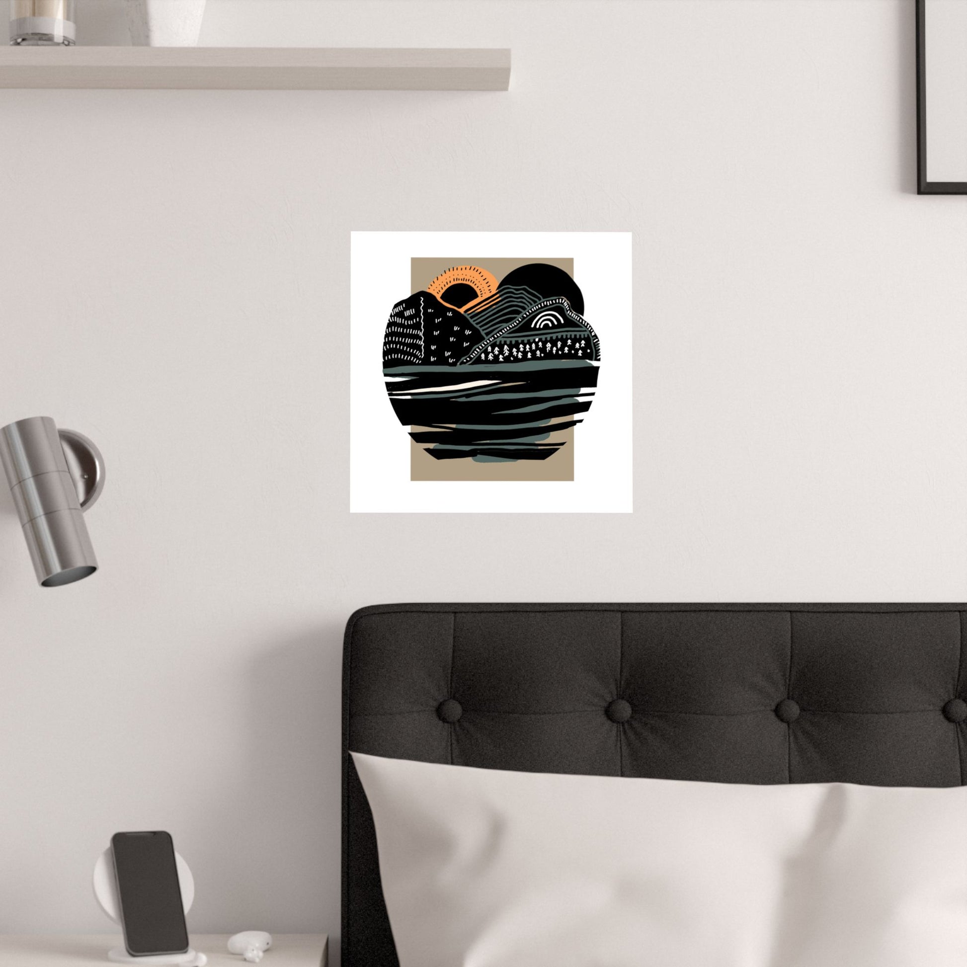 This satin poster captures a stylized landscape rendered in bold, earthy tones, layered hills, a textured shoreline, and a warm amber sun set against a muted square field. The low-glare satin finish and pigment inks keep the dark inky blacks and soft sage greens rich and dimensional, while the orange accent draws the eye. Printed on museum-grade paper, the image feels like a keepsake: tactile, archival, and ready to bring quiet, modern nature into an indoor space. It hangs easily with tape, tacks, or a frame and works in suit gallery walls, cozy reading nooks, or minimalist living rooms.