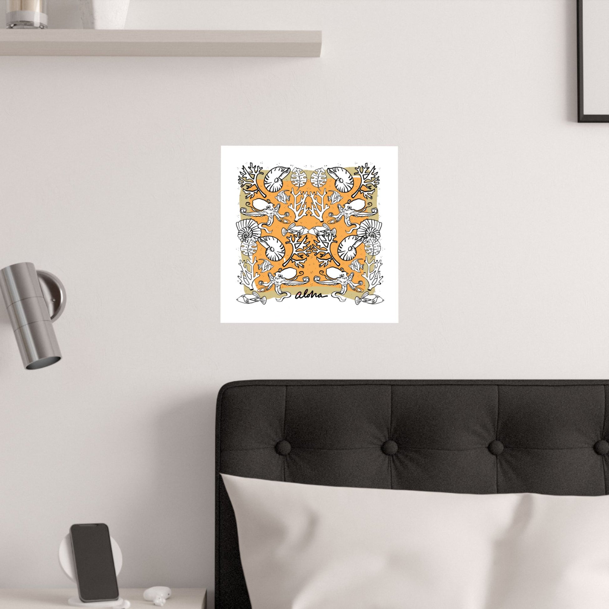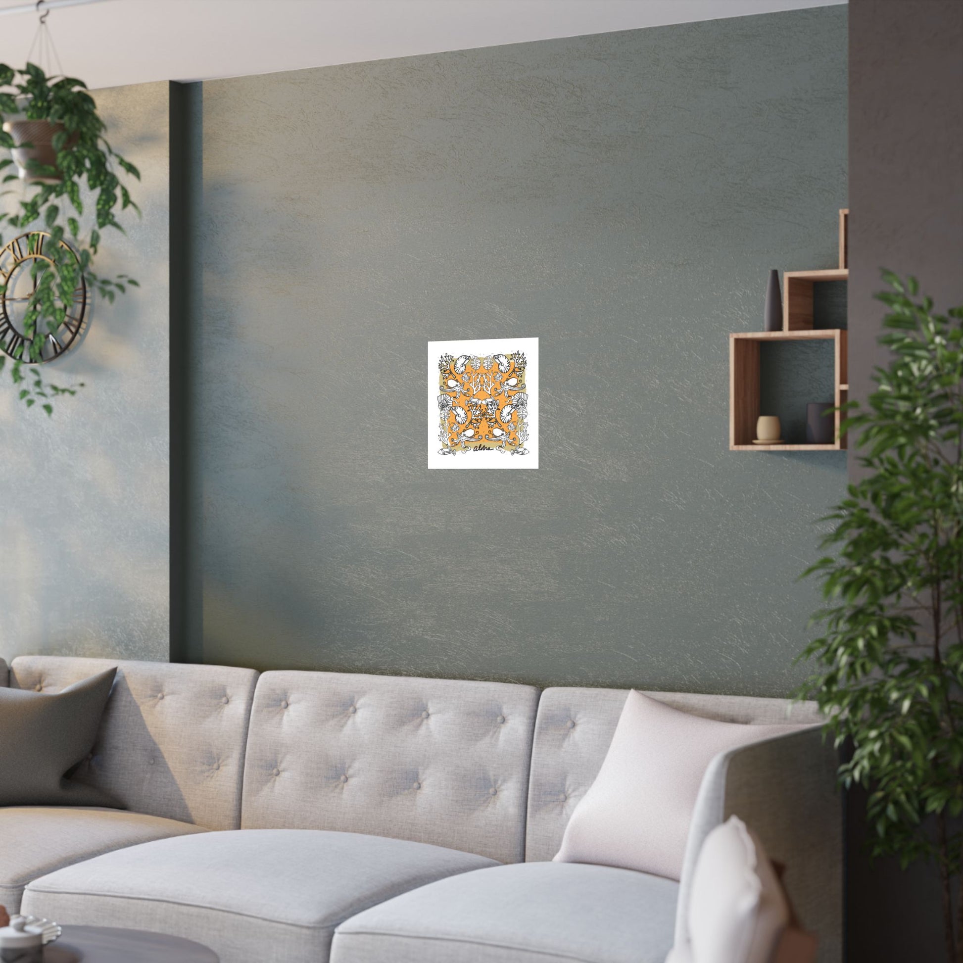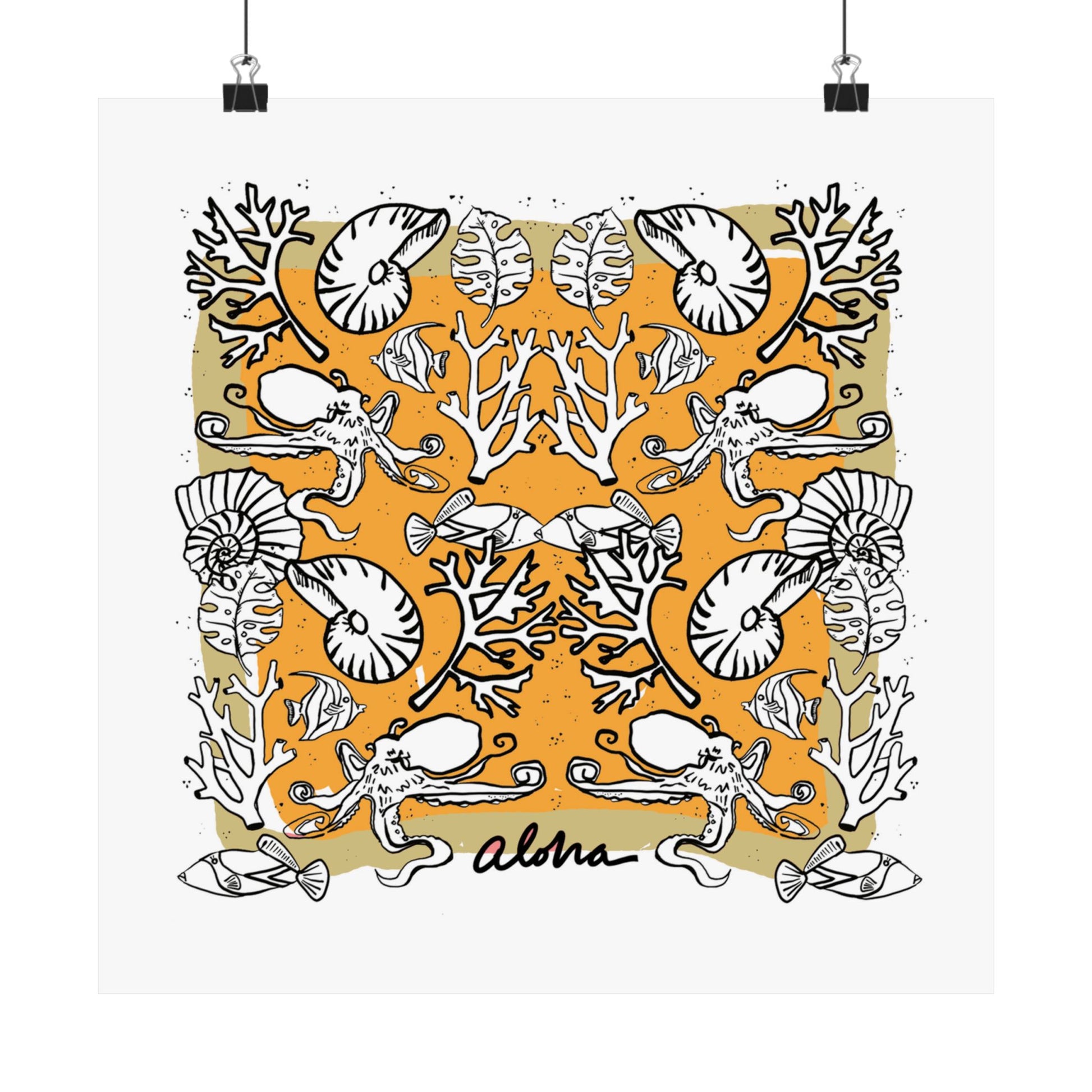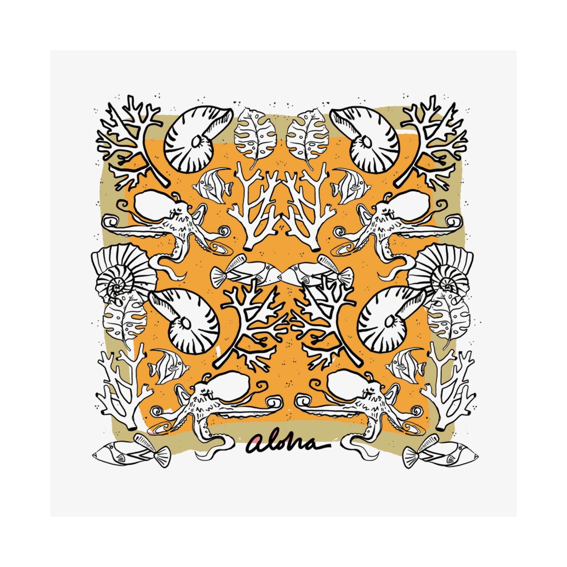 Bring a warm, coastal energy to your walls with this satin poster printed on museum-grade paper. The design mixes hand-drawn nautilus shells, coral branches, and whimsical sea motifs arranged in a mirrored, tapestry-like composition against a sunlit field. Low-glare satin finish keeps the colors rich and jewel-like without harsh shine, so the bright pigment inks sing while details remain soft and tactile. Hung in a kitchen, studio, or beach house hallway, it reads like a found illustration, nostalgic, playful, and quietly sophisticated. It suits someone who treasures seaside memories, artisan prints, and thoughtfully curated interiors.