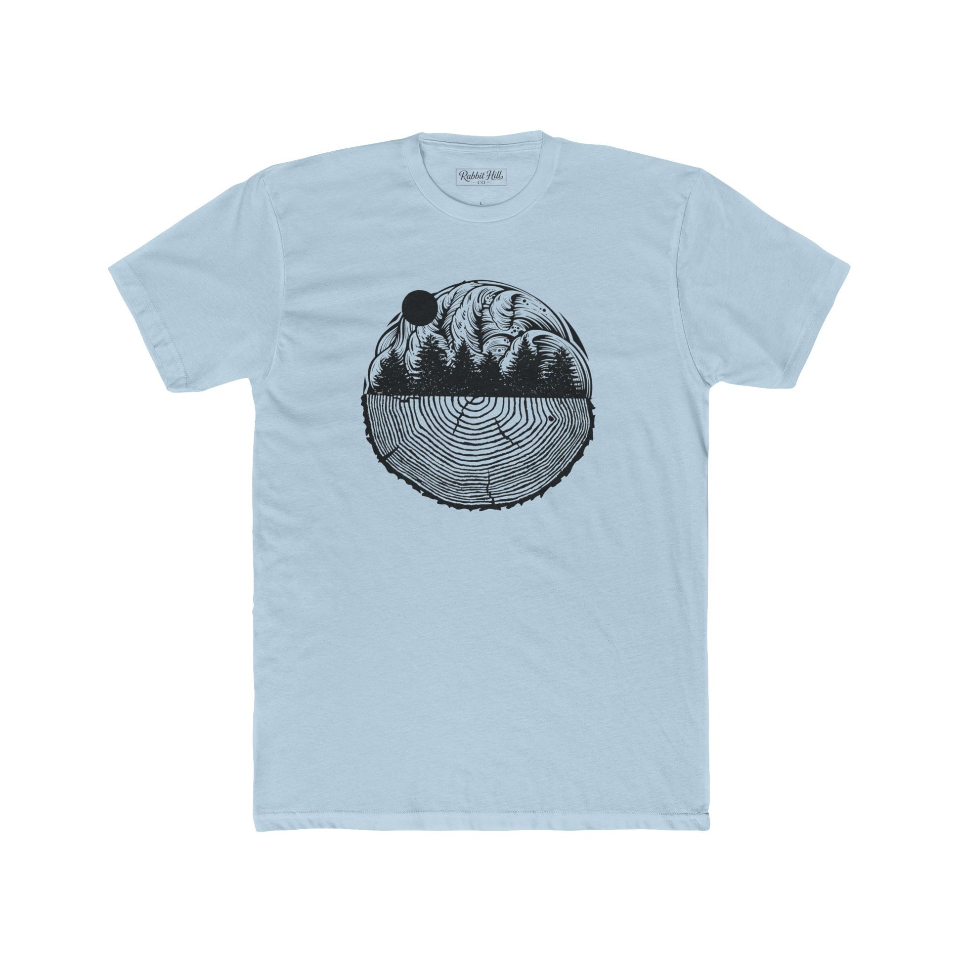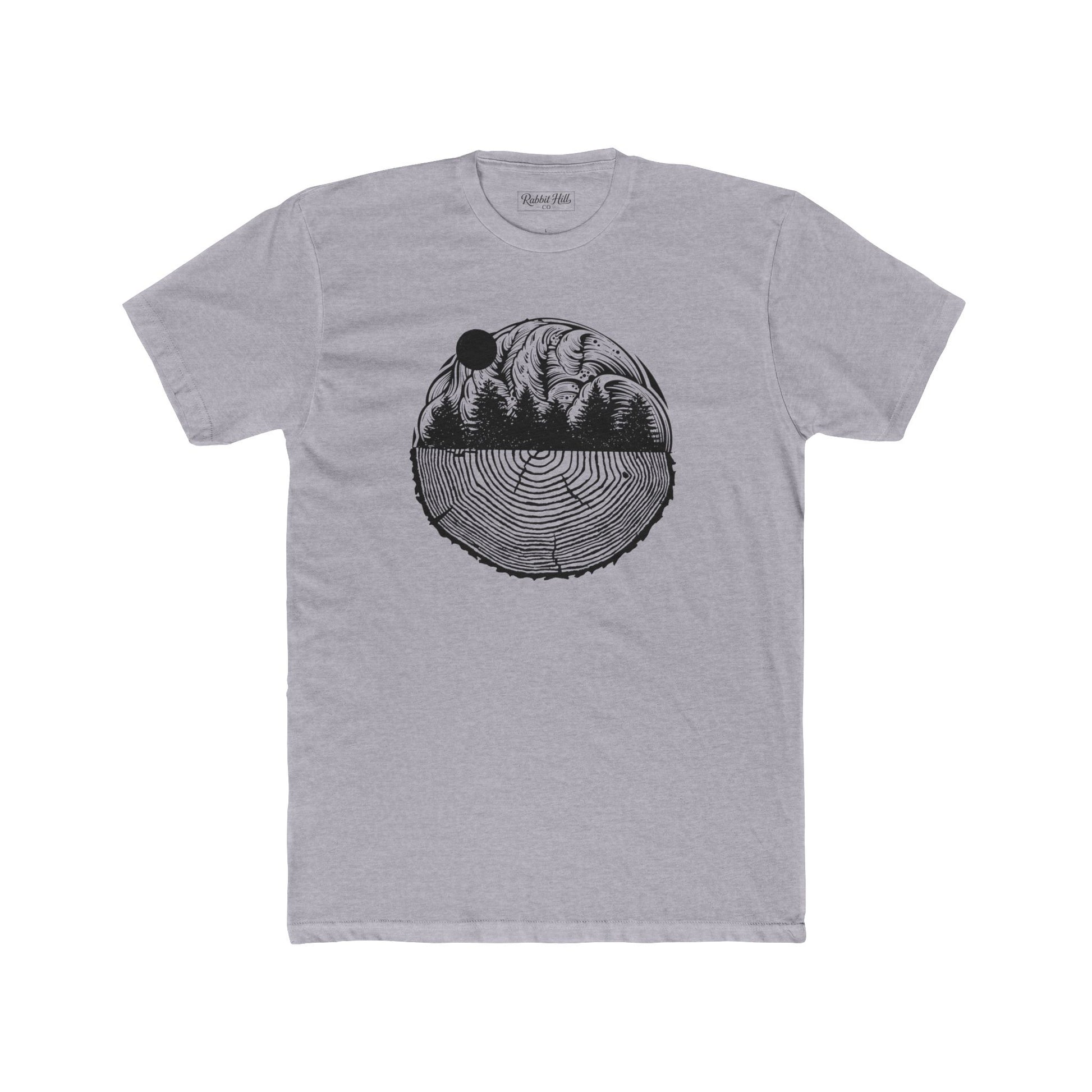 A light, lived-in crew tee that carries a quiet, woodsy story. The front art blends tree rings and a forest silhouette (half-map, half-memory) it reads like a snapshot from a twilight hike. Wear it under a flannel or under a denim jacket; it layers easily and moves with you. The fabric is thin but durable, with thoughtful construction (side seams, shoulder tape, ribbed collar) so the tee keeps its shape through repeat wears and washes. For people who collect moments in the outdoors rather than things, this tee feels like another quiet chapter in their rotation.
