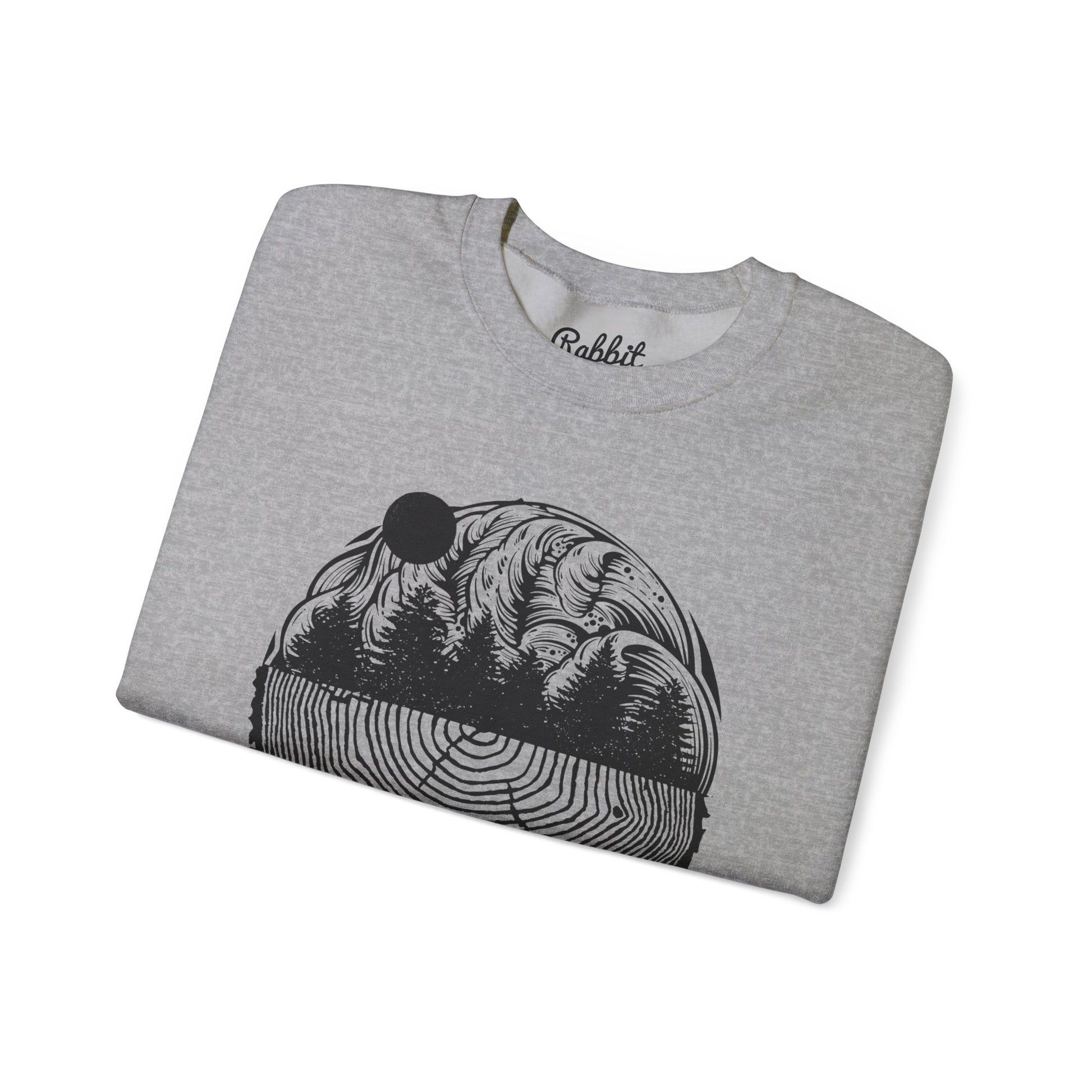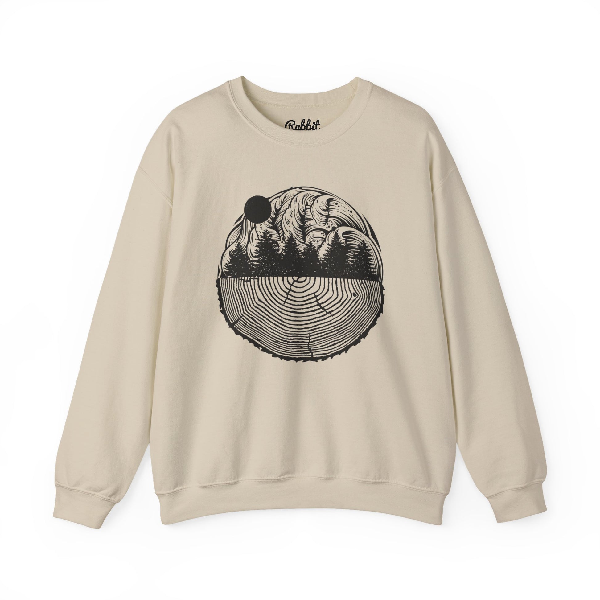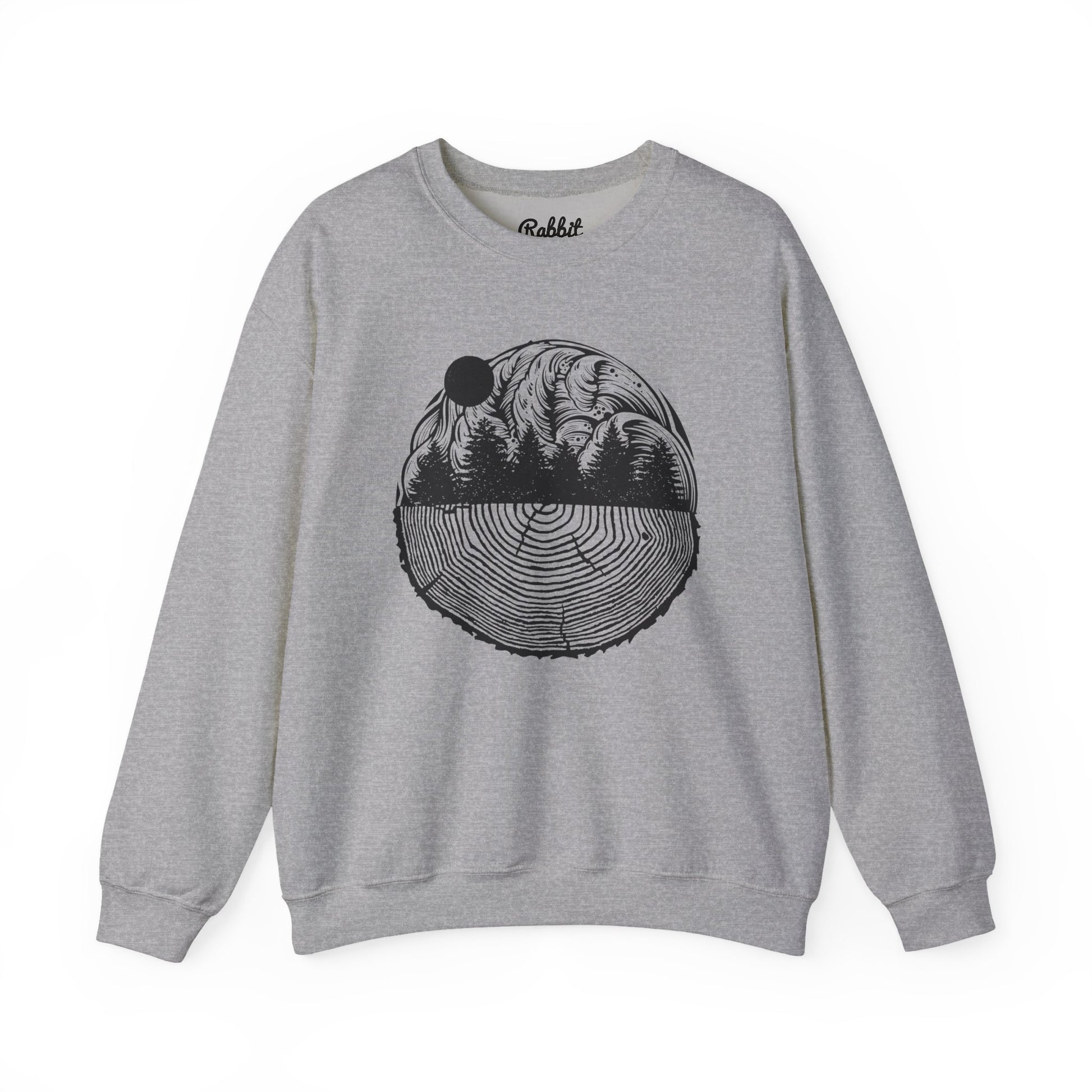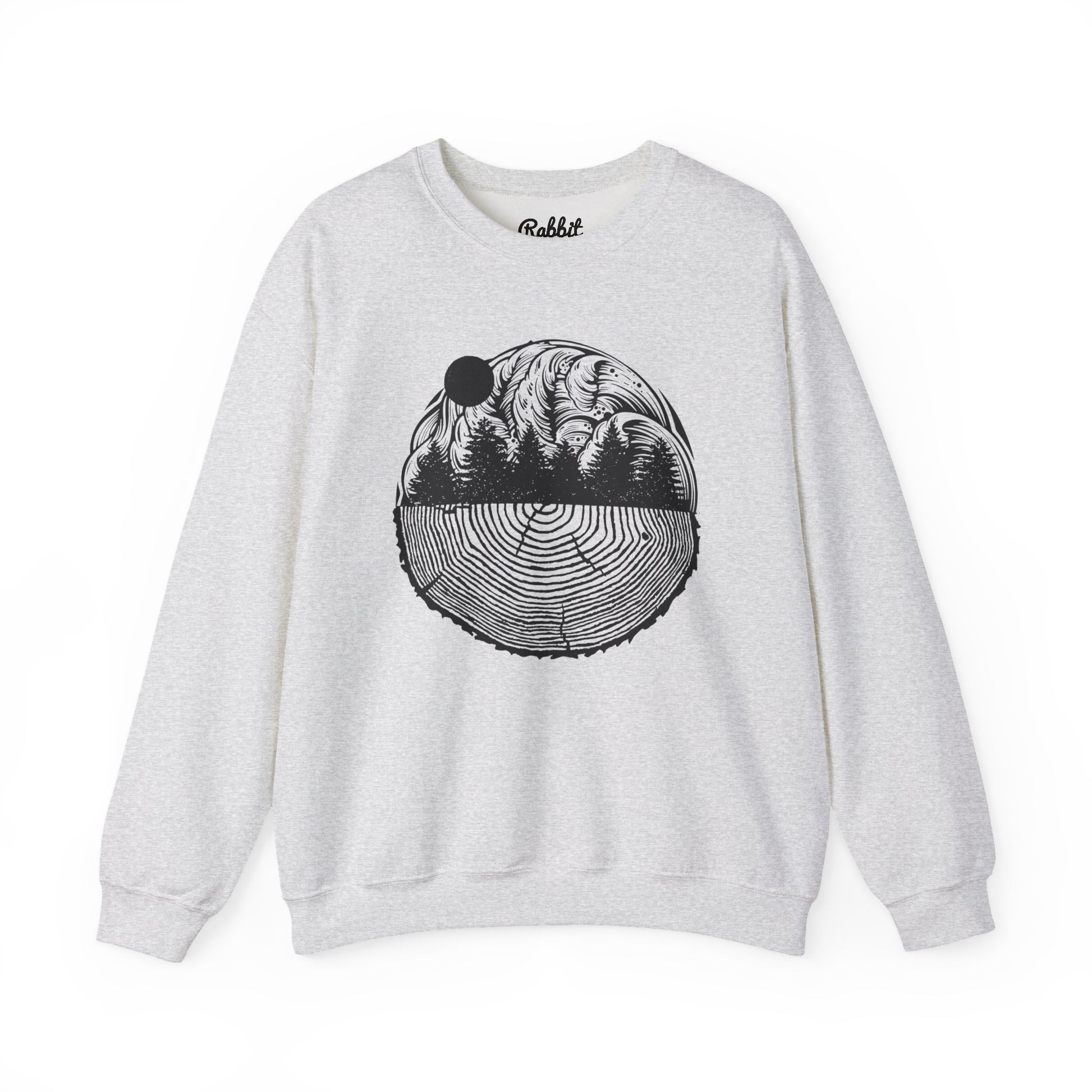 This cozy crewneck brings the forest with you. A hand-inked illustration wraps the front: a cross-section of a tree trunk with growth rings below, a dense treeline across the center, and a distant sun or moon haloed by wispy clouds above. The monochrome design feels quiet and thoughtful — like the moment you pause on a trail, lean against an old stump, and listen. It wears as everyday armor for slow mornings, campsite evenings, and long drives to nowhere. The medium-heavy cotton blend holds warmth without feeling bulky, while the classic cut keeps the silhouette clean and easy to layer. Subtle details — ribbed collar, double-needle stitching, and the tear-away label — make it comfortable enough to reach for again and again. Ethically sourced cotton and OEKO-TEX certified dyes mean the sweatshirt sits easy with both you and the planet.